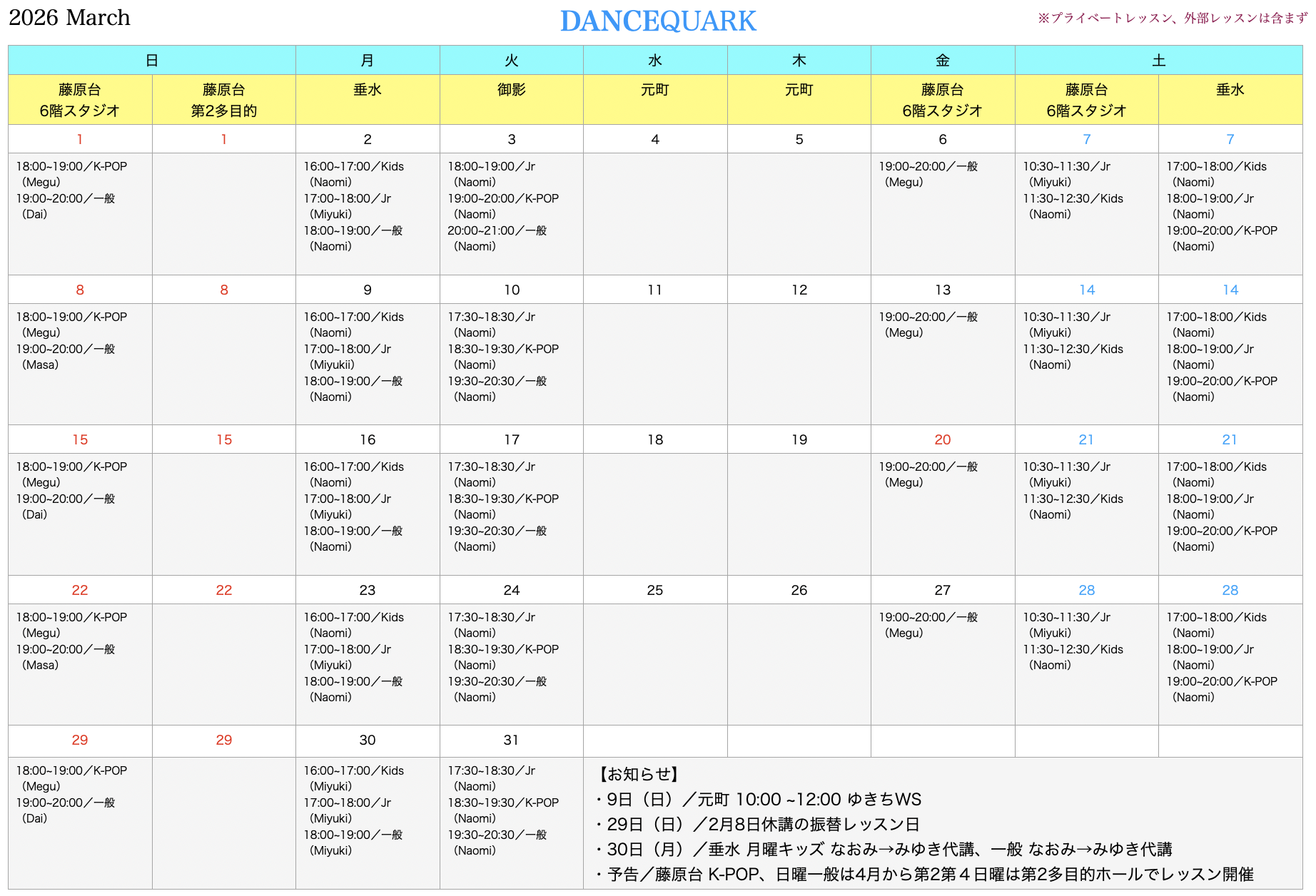 2026年3月レッスンスケジュール